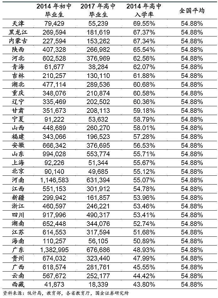 西藏,云南,广西等地高中入学率显著低于平均,很重要的原因就是当地中学建设本来也有些缺失,导致高中升学率较低。
