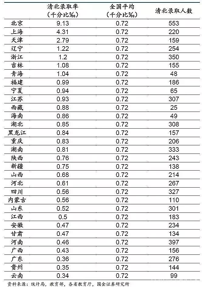 北京的清北录取率9.1‰,而云南的清北录取率近0.34‰,相差二十几倍。这和清华北大本身在北京当然也有一定关系。