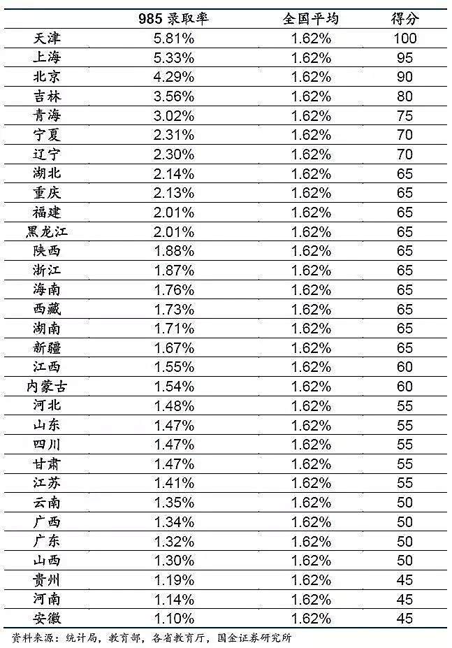 录取率是一个相当可测可比的指标,不管该地区好学校多寡,人口多寡,录取率总是一个比较客观可比的因素。我好学校少,但985整体录取率(考取率)高也行啊,我人少,但是别的学校给我们名额也相对更少,也没用,所以“录取率”是更客观可比的指标。