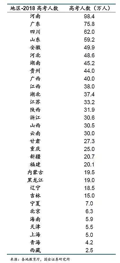 以2018的数据来看,河南近100万考生,广东75万,山东&四川&安徽也都是50万+的级别,但西藏,青海,上海等地高考人数不足5万。