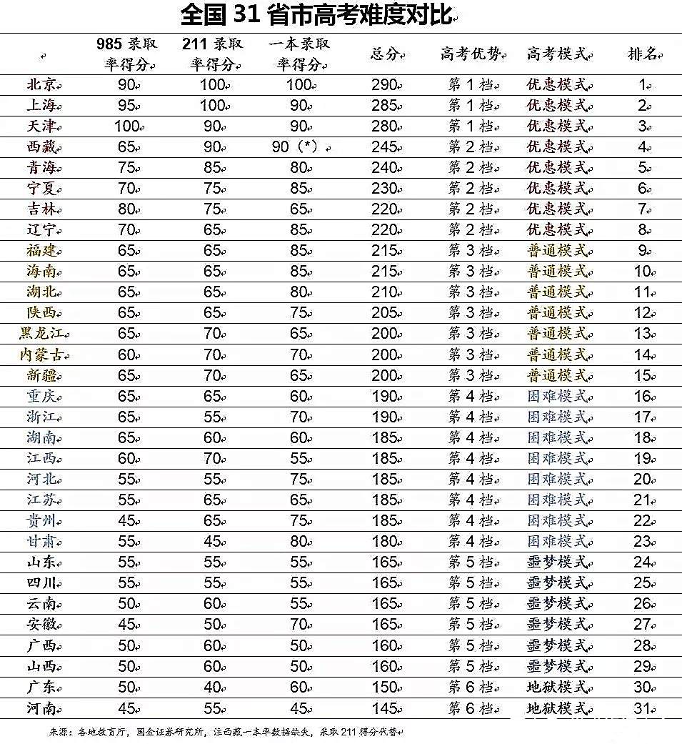 不同省份的高考难度,一直是一个争议严重的问题。每个地方的人,都会觉得自己是比较难的那一个。因为其实不管在哪里,高考都是件不容易的事情。高考录取,本质上是一种“省内筛选”,是全国各个高校,以省(直辖市,自治区)为单位进行的竞争,而各省之间的录取难度是有所不同的。本文,以若干个客观指标的量化比对,来评价并排序中国各省的高考难度,看一看哪些省份高考是地狱模式,哪些省份高考是简单模式。01高考是个什么难度级别的考试