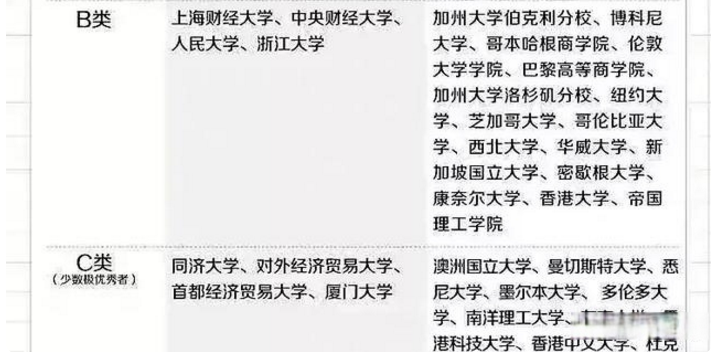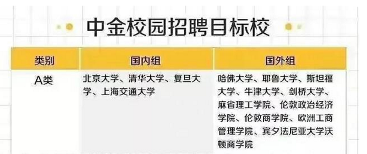 从出炉的中金校园招聘的目标院校就是可以看出来的,对于大学生的要求院校,全都是顶尖名校的状态,一共分为ABC三个不同的类别。
