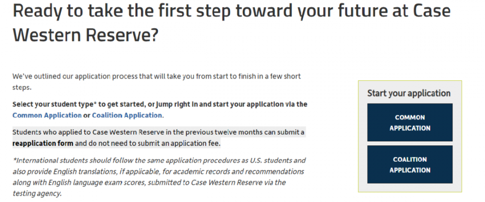 CWRU对于申请者来说非常好的一点是,它不仅不收取国际生的申请费(不过这个仅限于,在过去12个月内申请了凯斯西储大学的学生,再次申请可以不交申请费),甚至都不需要申请者提交Supplement文书,只需要一篇主文书即可。
