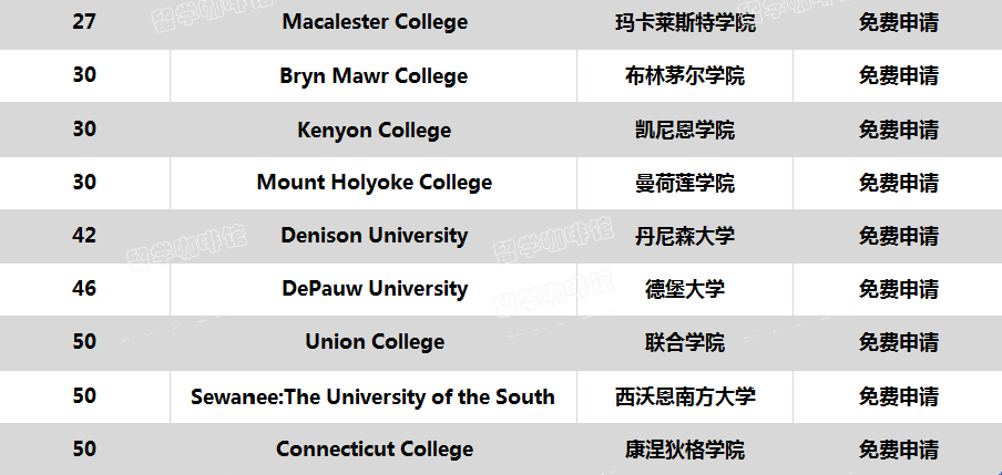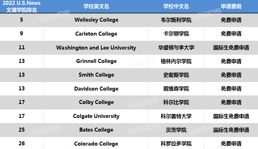 留学生免申请费的文理学院(全美排名前50)