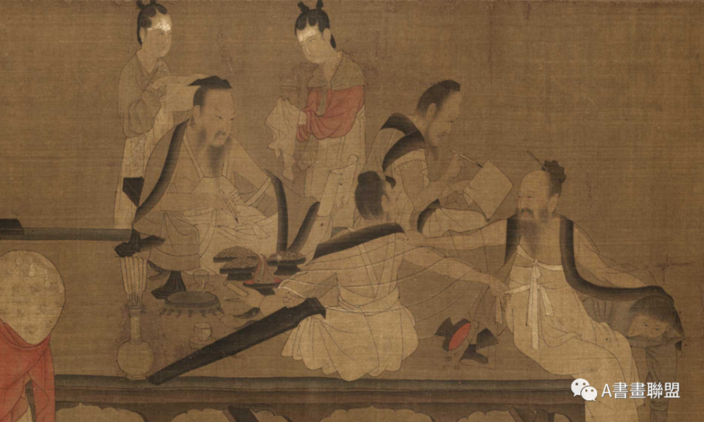 《北齐校书图》宋代摹本,纵29.3厘米,横122.7厘米,这图卷所画的是北齐天保七年(556年)文宣帝高洋命樊逊和文士高干和等11人负责刊定国家收藏的《五经》诸史的情景。据宋人题跋,原为杨子华作,水墨着色,横卷,卷首画一少年侧立,捧经书阅读;一学者坐椅上执笔书写,侍从二人托纸砚;一人执书卷,身后女侍二人。中段榻上二人书写,一使侍转身与抚琴人对话,榻后女侍二人,榻侧三女侍各手持几、琴、壶而立。卷尾画二马,一人拱手执鞭,二人牵马,一位牵马人似西域人。
