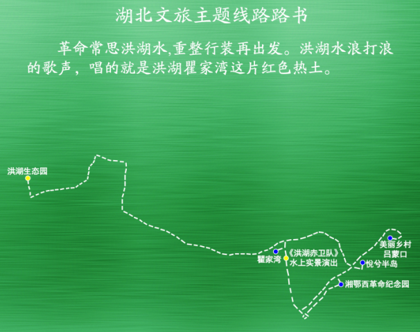 主要景点:悅兮半岛——瞿家湾——洪湖生态园——湘鄂西革命纪念园——《洪湖赤卫队》水上实景演出——美丽乡村吕蒙口。