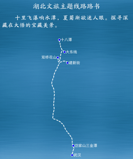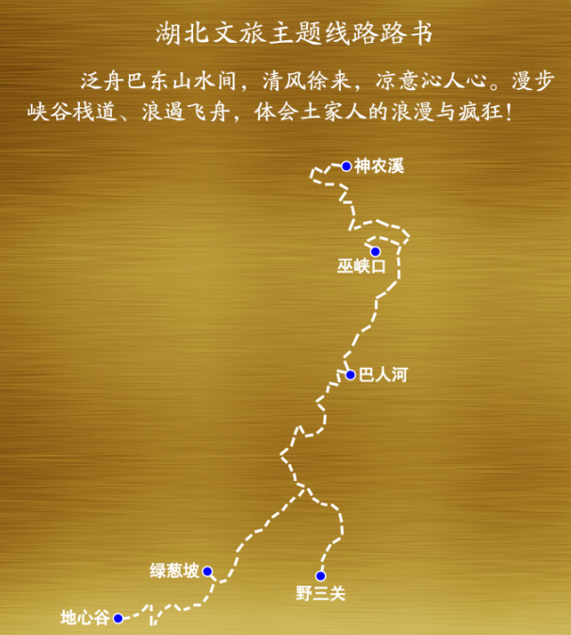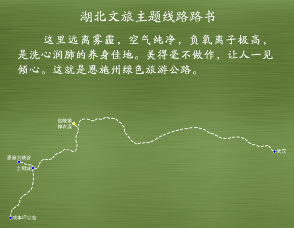 武汉——信陵镇(465.4公里,车程约6小时)——神农溪——土司城(188.2公里,车程约3.5小时)——恩施大峡谷(49公里,车程约1.5小时)——咸丰坪坝营(214.6公里,车程约3.5小时)。