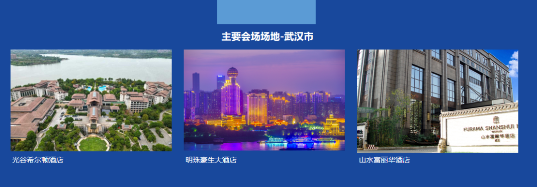 武汉:武汉国际博览中心——武汉国际会展中心——中国光谷科技会展中心——东湖宾馆——武汉欧亚会展国际酒店——光谷希尔顿——明珠豪生大酒店——马可波罗酒店——山水富丽华酒店——金盾国际大酒店。