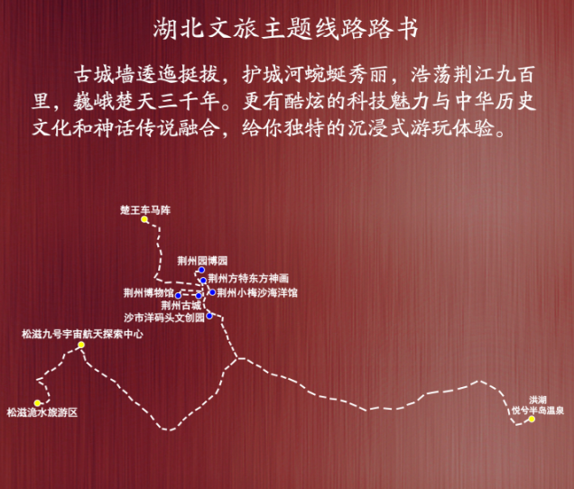 主要景点:荆州古城——荆州博物馆——荆州方特东方神画——荆州园博园——荆州小梅沙海洋馆——楚王车马阵——沙市洋码头文创园——洪湖悦兮半岛温泉——松滋九号宇宙航天探索中心——松滋洈水旅游区。
