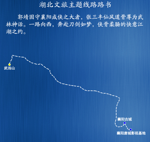 主要景点:襄阳唐城影视基地——襄阳古城——武当山(金庸《倚天屠龙记》外景拍摄地)。