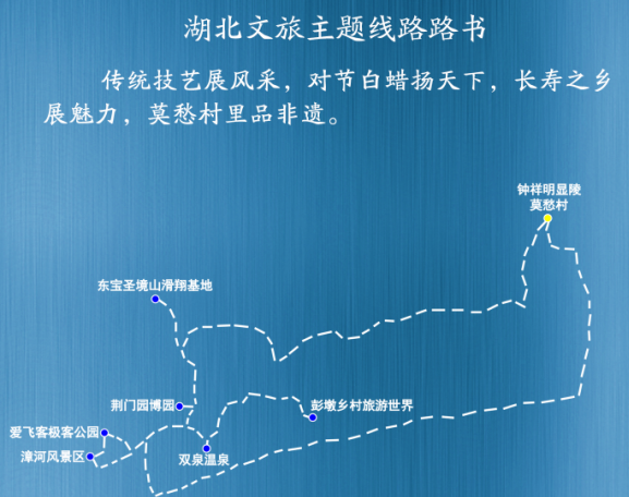 主要景点:双泉温泉——荆门园博园——东宝圣境山滑翔基地——钟祥明显陵——莫愁村——漳河风景区——爱飞客极客公园——彭墩乡村旅游世界。