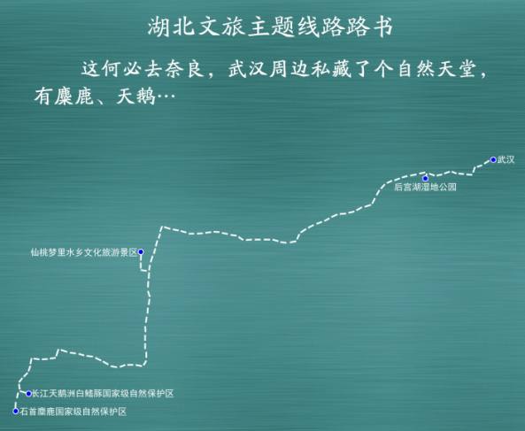 武汉—后宫湖湿地公园—仙桃梦里水乡文化旅游景区(135.7公里,车程约1.5小时)——长江天鹅洲白鳍豚国家级自然保护区(139.9公里,车程约1.5小时)——石首麋鹿国家级自然保护区(27.7公里,车程约0.5小时)。