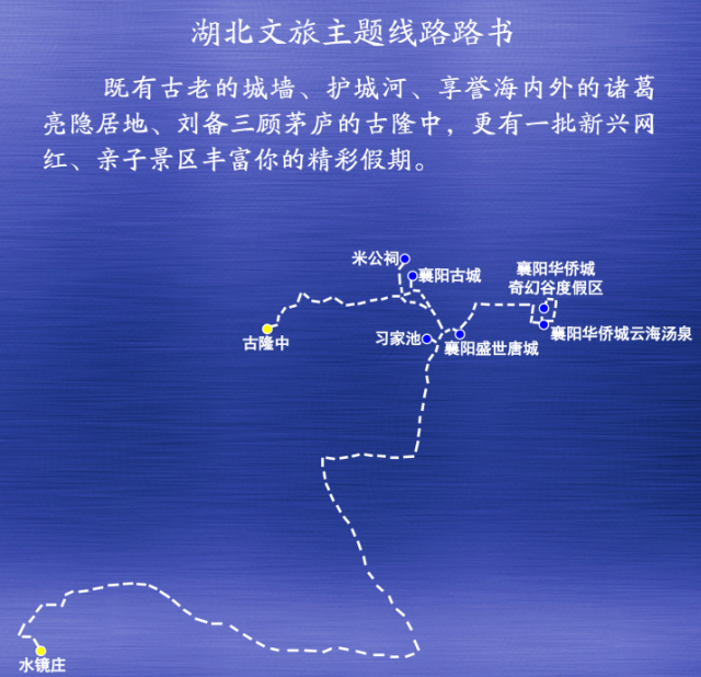 主要景点:襄阳华侨城奇幻谷度假区——襄阳华侨城云海汤泉——襄阳盛世唐城——襄阳古城——古隆中——米公祠——习家池——水镜庄。