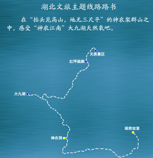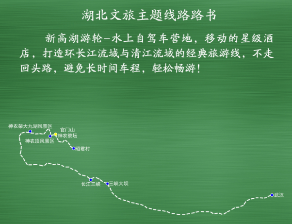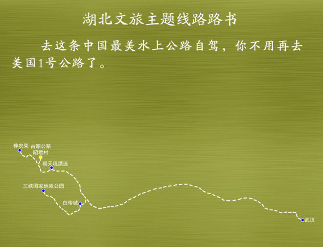 武汉——三峡大坝(365.2公里,车程约4.5小时)——长江三峡(111.3公里,轮船约3.5小时)——神农架大九湖风景区(153.5公里,车程约3小时)——神农顶风景区(32公里,车程约1小时)——官门山——神农祭坛(12公里,车程约0.5小时)——昭君村(46.9公里,车程约1小时)。