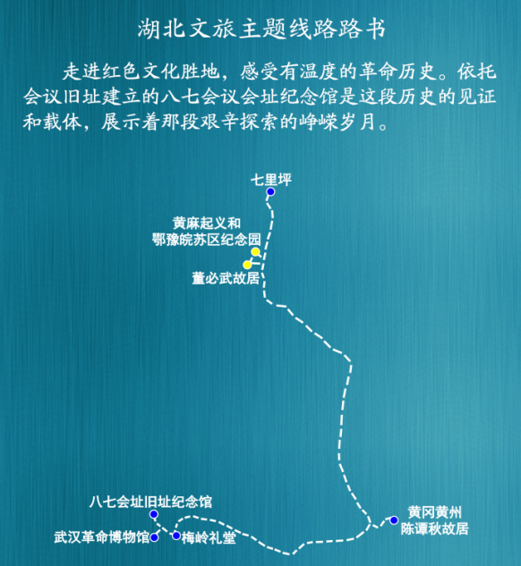 主要景点:武汉革命博物馆——八七会址旧址纪念馆——梅岭礼堂——黄冈黄州陈谭秋故居——董必武故居——七里坪——黄麻起义和鄂豫皖苏区纪念园。