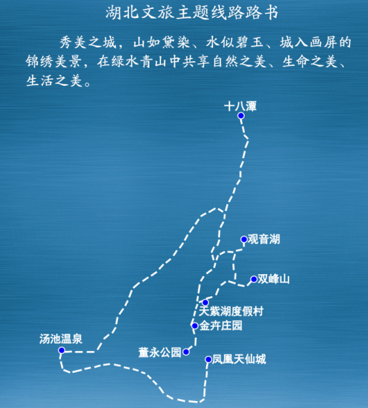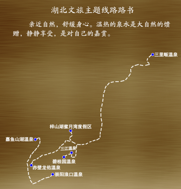 主要景点:梓山湖蜜月湾度假区——三江温泉——碧桂园温泉——三里畈温泉——赤壁龙佑温泉——嘉鱼山湖温泉——崇阳浪口温泉。