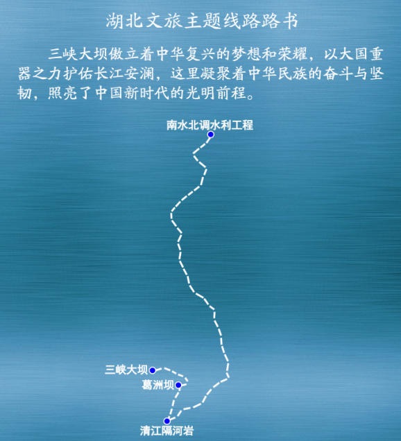 主要景点:三峡大坝——葛洲坝——清江隔河岩——南水北调水利工程。
