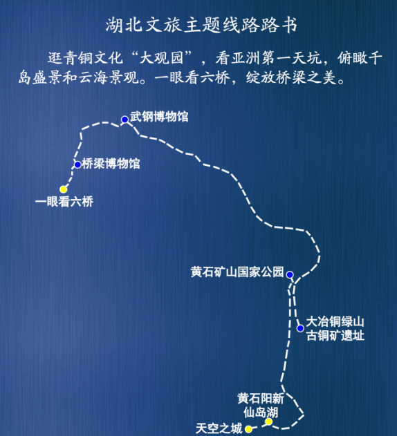 主要景点:大冶铜绿山古铜矿遗址——黄石矿山国家公园——黄石阳新仙岛湖——天空之城——武钢博物馆——桥梁博物馆——一眼看六桥。