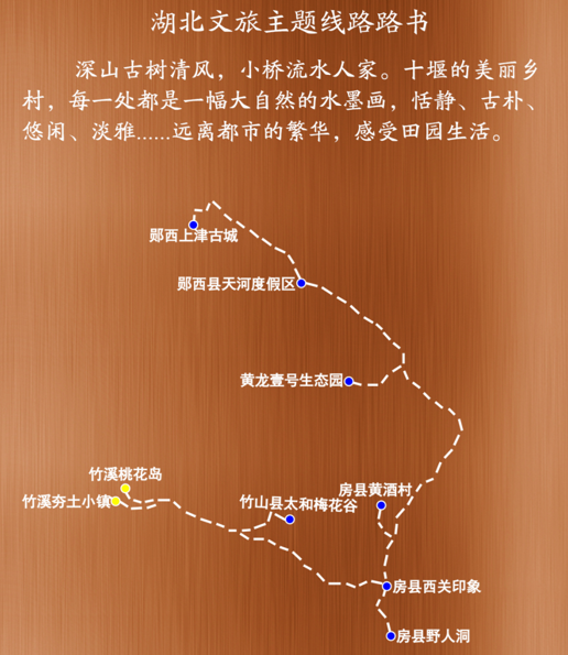 主要景点:竹山县太和梅花谷——竹溪夯土小镇——竹溪桃花岛——房县黄酒村——房县西关印象—房县野人洞(谷)——黄龙壹号生态园——郧西县天河度假区——郧西上津古城。