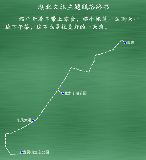 武汉二环——北太子湖公园——东风大道——龙灵山生态公园(27.4公里。车程约0.5小时)。