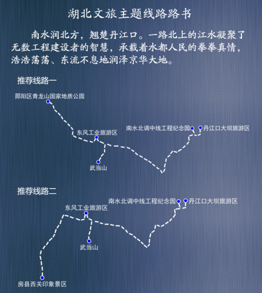 线路一:丹江口大坝旅游区——南水北调中线工程纪念园——武当山——东风工业旅游区——郧阳区青龙山国家地质公园。