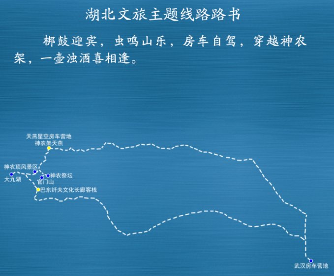 武汉房车营地——天燕星空房车营地 (483公里,车程约6小时)——神农架天燕——官门山——神农祭坛———神农顶风景区(12公里,车程约0.5小时)——神农架大九湖风景区(32公里,车程约1小时)——大九湖——巴东纤夫文化长廊客栈(45公里,车程约1.5小时)——武汉(453公里,车程约6小时)。