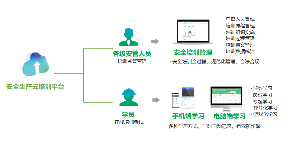 平台以优质的多媒体安全培训课程资源为核心,为培训监管及管理人员模块化提供贯穿安全培训全过程的人员管理、课程管理、项目管理、档案管理、数据统计等管理服务;为学员提供电脑、手机多端结合的便捷学习方式。
