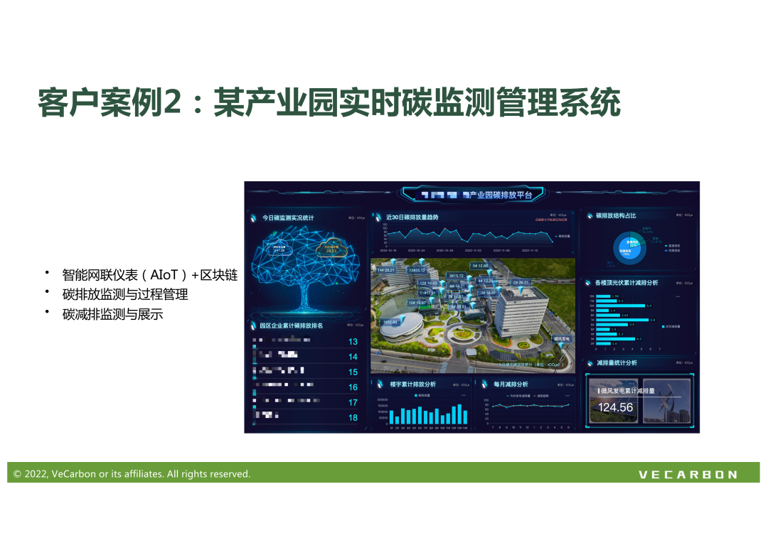 这就是我们通过 AloT, 也就是智能网联仪表的数据对接来跟区块链连接,实现了碳排放过程的监测、管理以及展示。有一个可视化的数据管理大屏能够清晰地展示过程。另外就是碳减排效应的展示,包括楼顶光伏以及微风发电系统的展示。