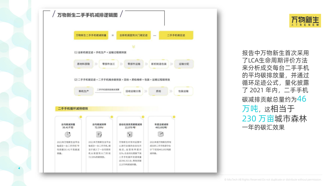 包括循环经营里面的另一家巨头万物新生,原名是爱回收,我们也是帮助在做 ESG报告的基础上,增加了碳计算的亮点,也是首次采用了LCA生命周期的评价方法,来分析每台二手手机的平均碳排放量。通过碳足迹公式,量化披露了2021年内,二手手机碳减排贡献总量为46万吨,相当于230万亩城市森林一年的碳汇效果。