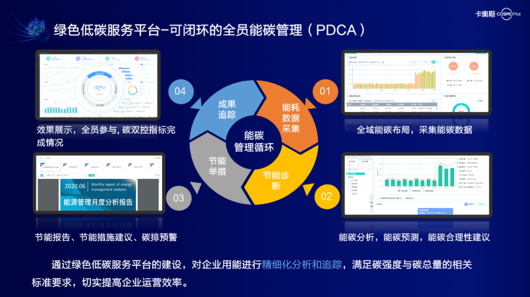我们遵循 PDCA 可闭环的能碳管理,通过能耗数据采集—节能诊断—节能举措—成果追踪,实现 PDCA 的循环。通过绿色低碳服务平台的建设,对企业用能进行精细化分析和追踪,满足碳强度与碳总量的相关标准要求,切实提高企业运营效率。
