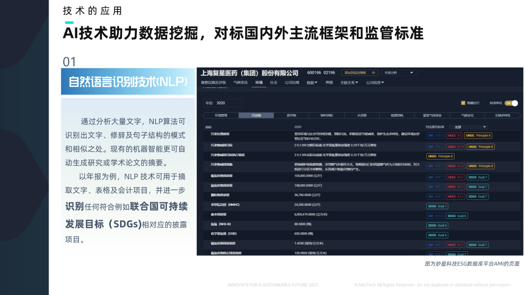 这是我们数据库的截图,以一个上市公司为例。意向下面的指标点有很多定量和定性的指标,妙盈科技的ESG框架底层的指标有1000多个,标准化指标有700多个。但是对于一家上市公司而言,并不是说每个指标都需要披露,实质性相关联的指标能有200到300个。目前来看数据库的分析功能以及对标功能也非常细致。