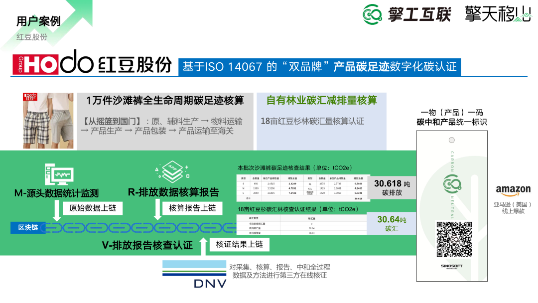 第一个案例是红豆。这个案例获得了官方媒体的多次报道。我们给他做了1万条沙滩裤的全生命周期的碳足迹核算,从摇篮到国门,包括原、辅料生产—物料运输—产品生产—产品包装—产品运输到海关截止。这1万条沙滩裤用了我们MRV的服务,算出来的碳排放量是30.618吨。