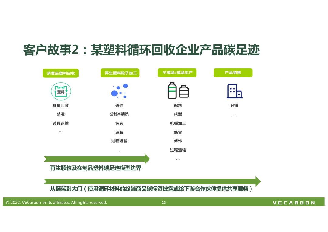 这是我们跟一家国内头部的塑料回收企业去做回收塑料的碳足迹追踪。通过回收一次性的饮料瓶跟餐盒,拿到在江西的工厂进行分批运送之后,到工厂里面进行分拣、清洗,再去进行破碎、色选、造粒形成塑料颗粒原材料。塑料颗粒是将来中游以及下游制作汽车内饰,包括无纺布等等的重要原材料。