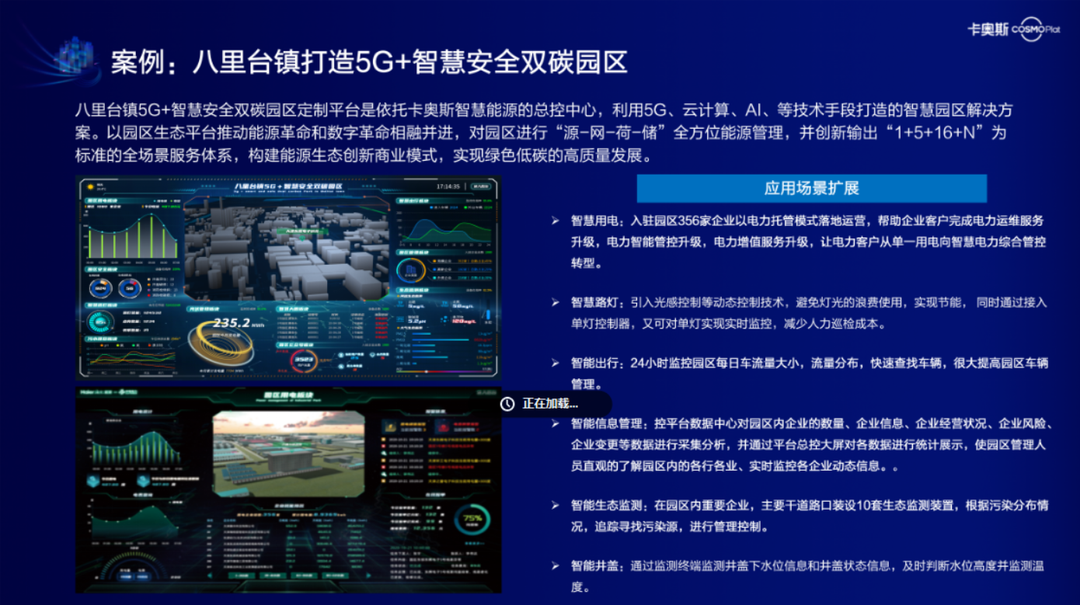 最后给大家展示一下案例,在天津八里台镇打造5G+智慧安全双碳园区。园区已经有300多家企业,第一期工程已经把平台打造起来了,目前是正在做新能源项目以及经营减排项目。包括应用界面还在升级迭代,一些专业的板块还在优化。