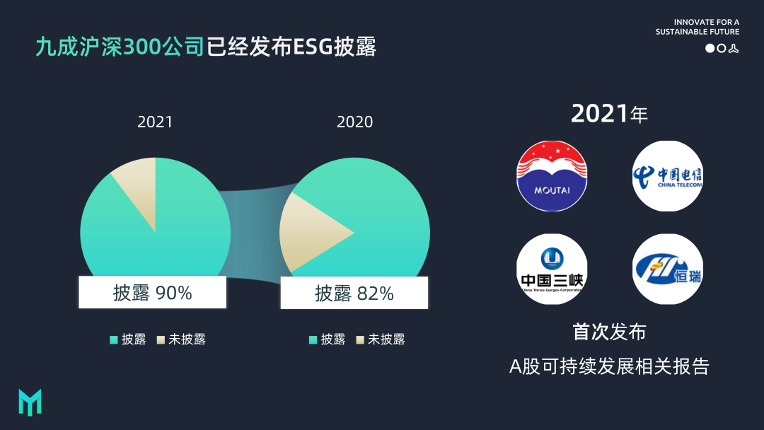 对于企业端,30%的A股上市公司披露ESG信息,5%的A股上市公司披露范畴一、范畴二温室气体排放数据。表明从企业端也开始逐步地披露这方面的数据,虽然比例还并不是很高,企业的意识还有待于加强。但车已经开起来了,车速会越来越快。茅台、中国电信、三峡包括恒瑞等很多大型企业,都首次发布了A股可持续发展相关报告。