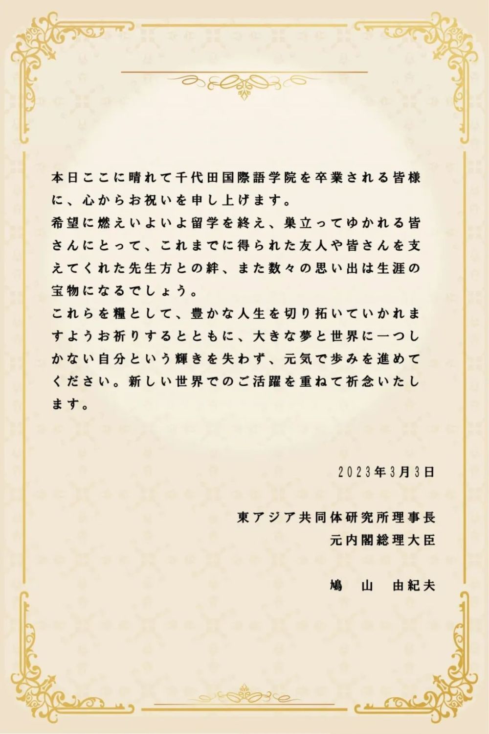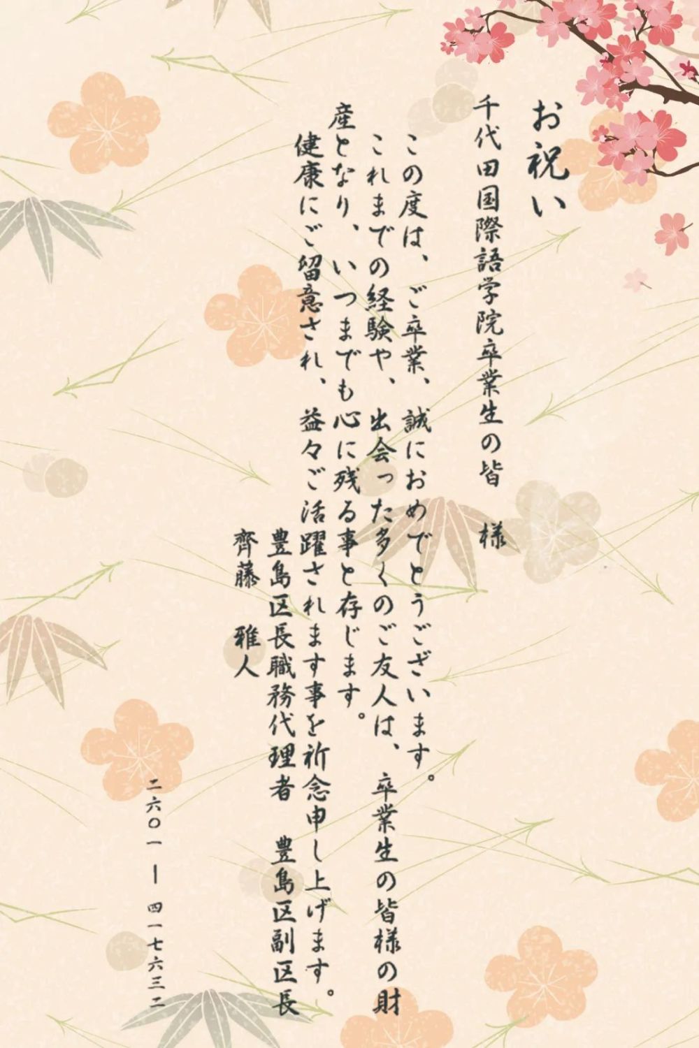此外,典礼主持人代读了东亚共同体研究所理事长、元内阁总理大臣鸠山由纪夫和丰岛区长职务代理者、副区长斋藤雅人等一众友好团体向千代田国际语学院此次毕业式发来的贺电。
