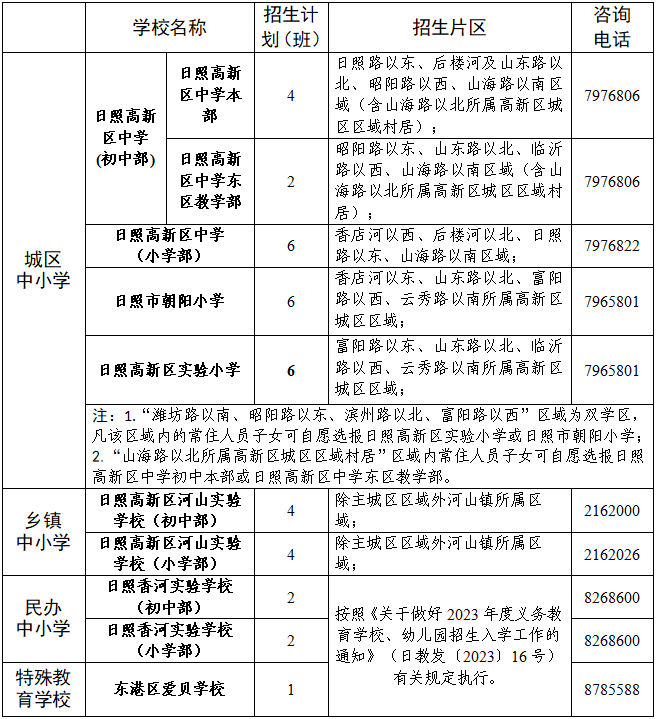 因东港区与高新区区划调整,涉及的日照北路以西区域、山东路以北高新二路以南区域、山东路以北临沂路以西兖州路以东区域内的常住居民子女,2023年仍可以按照东港区2019年招生划片方案选择在原片区学校申请学位,也可以在2023年两区新划片区学校申请学位,由适龄儿童及其监护人自愿选择。