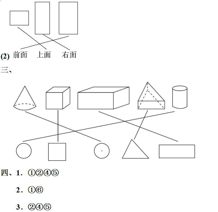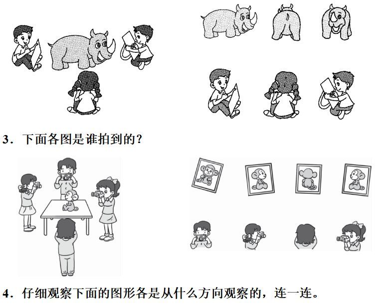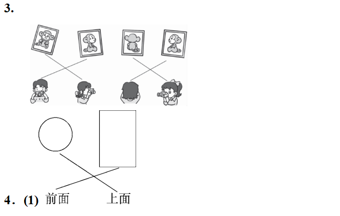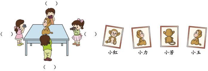 五、下面四张照片是四个小朋友从不同的位置拍到的,根据照片,把他们的名字填在相应的括号里。