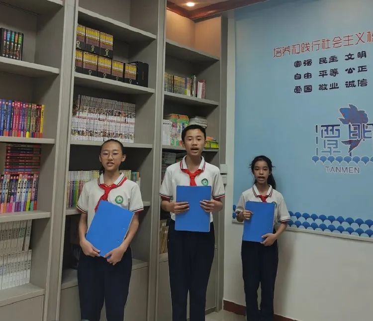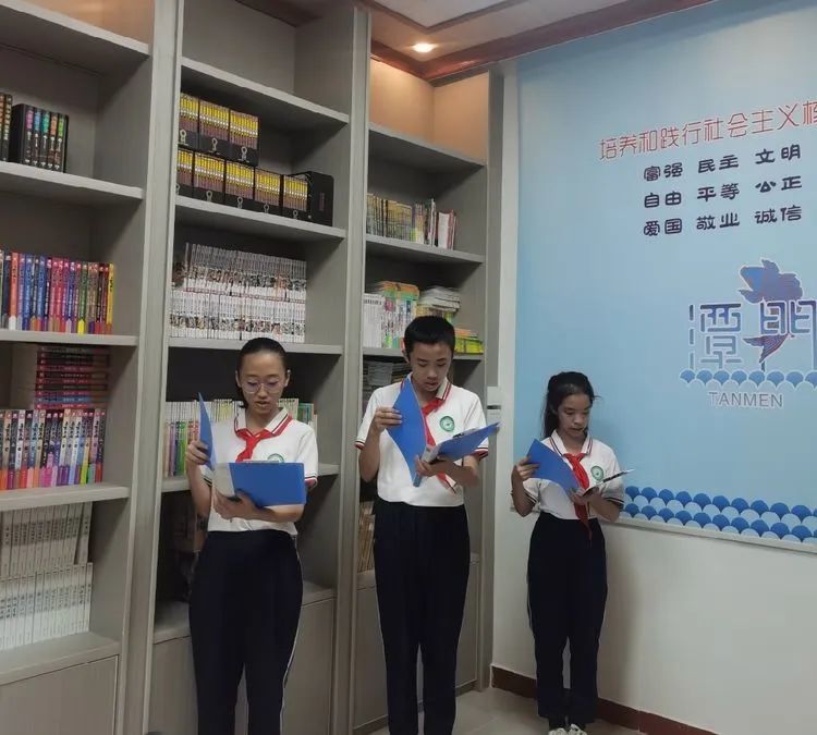 队员们迈着轻盈的步伐,在潭门镇政府工作人员的指引下,来到新时代文明实践所,在书屋里寻找自己喜欢的书籍进行阅读,还一起讨论书中的故事情节。有的队员表示“我还没有看够呢,还要回家接着看!”也有的队员相约继续一起读书。当读到喜欢的散文时,队员们还情不自禁地在书屋内朗诵起来,他们精神饱满,姿态得体大方,朗读流利,声音洪亮,让我们一起来看看吧!