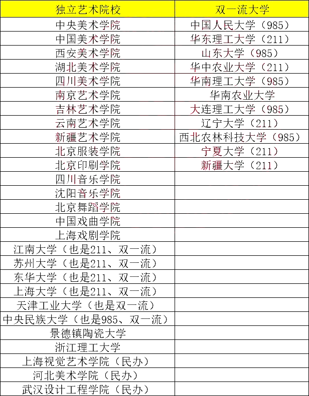 所以,双一流大学(非独立艺术院校)是不组织美术类校考的,48所独立设置的本科艺术院校(含部分参照执行院校)也有不少是不组织美术类校考的。