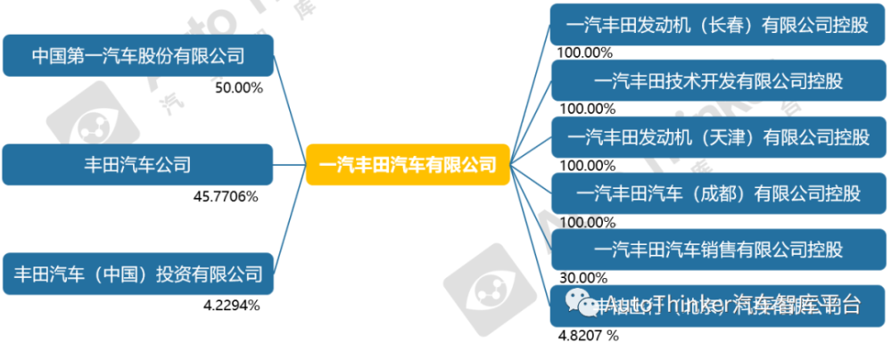 一汽丰田为中日合资大型外资企业,中日股比为50%:50%,初始注册资本为33亿元人民币,历经数次股权变更,现有股权结构为中国一汽50%,日本丰田45.77%,丰田中国4.23%,注册资本196520.002万美元。