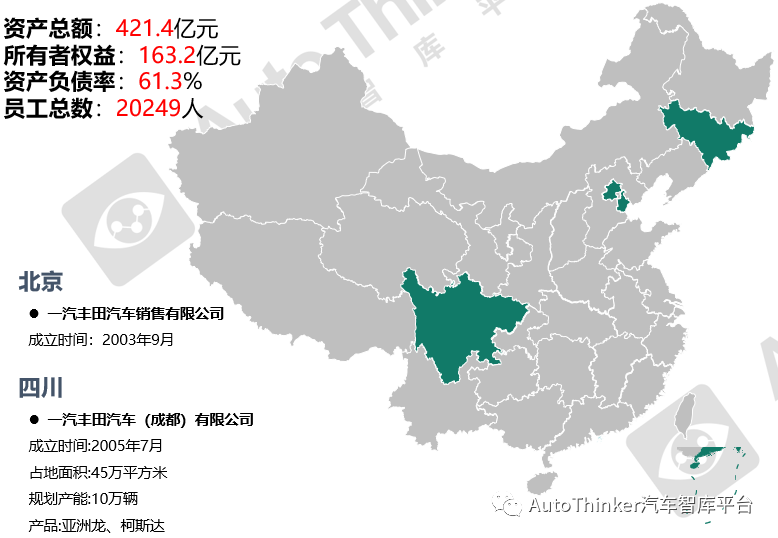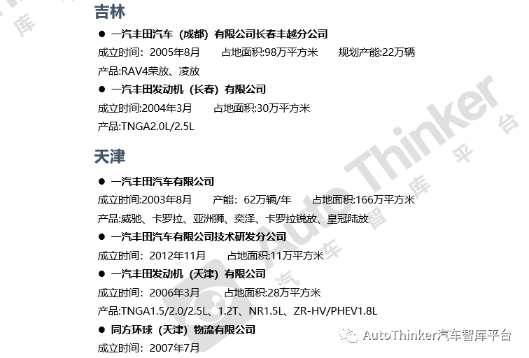 目前,一汽丰田系企业在国内主要有6家企业,具体包括有,四川一汽丰田汽车有限公司(简称“SFTM成都”)及长春丰越公司(简称“SFTM长春”)、天津一汽丰田发动机有限公司(简称“TFTE”)、一汽丰田(长春)发动机有限公司(简称“FTCE”)。