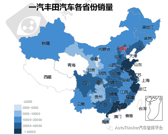 分省份来看,2022年1-11月国内轿车市场,广东销量最高,达到85730辆,占有率达到7.9%,占有率最高的省份是辽宁,达到9.7%。2022年1-11月国内SUV市场,广东销量最高,达到59388辆,占有率达到6.3%,占有率最高的省份是辽宁,达到7.3%。从全国分布来看,一汽丰田主要销售省份集中在广东、浙江、江苏、山东、辽宁几大省份,沿海城市销量高于内陆城市。