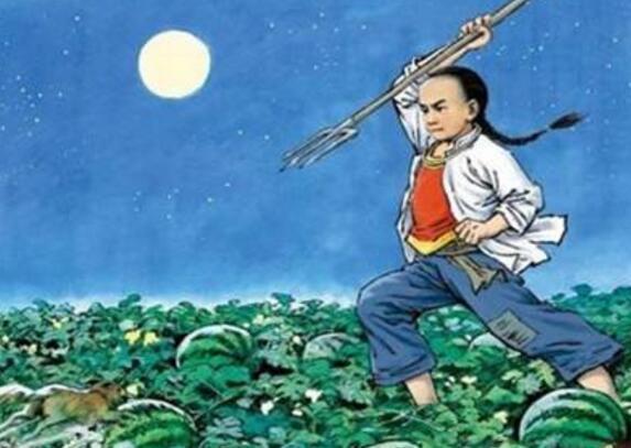 “深蓝的天空中挂着一轮金黄的圆月,下面是海边的沙地,都种着一望无际的碧绿的西瓜。其间有一个十一二岁的少年,项带银圈,手捏一柄钢叉,向一匹猹尽力地刺去。那猹却将身一扭,反从他的胯下逃走了。”