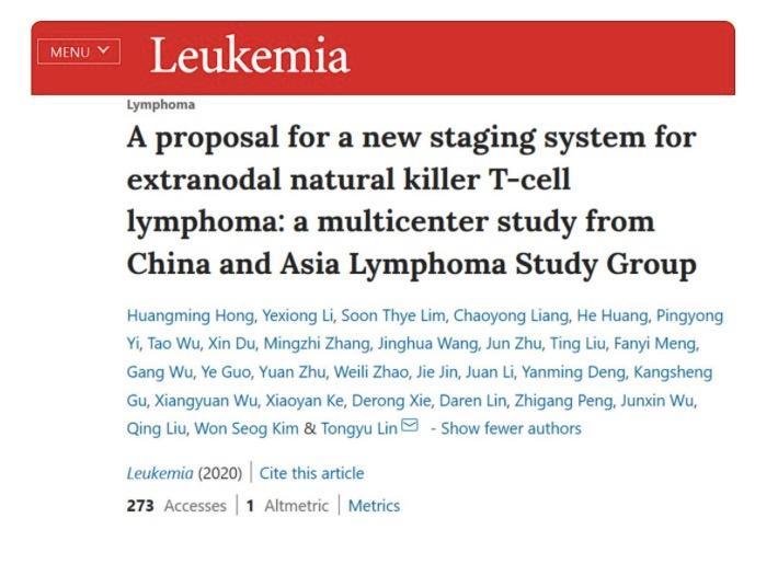 日前,由中山大学肿瘤防治中心林桐榆教授团队牵头,全球30个肿瘤中心共同参与,建立的结外鼻型NK/T细胞淋巴瘤的新分期系统相关研究成果在线发表于全球著名学术期刊《白血病》上。
