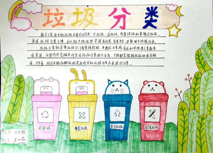 队员们纷纷积极通过网络搜集垃圾分类的知识,浏览相关浏览和文章资讯,在云上队会中积极分享对垃圾分类的重要性以及如何身体力行践行垃圾分类的深刻认识,云上队会调动了全体队员践行垃圾分类的积极性;队员们认真搜集科学的垃圾分类方法和如何践行垃圾分类等有关知识,用心制作成手抄报,在班级群里展示,和同学们互相讨论如何在生活中践行垃圾分类;通过此次活动,队员深刻认识到了垃圾分类的重要性,树立了积极践行垃圾分类的意识,纷纷表示会号召家人践行垃圾分类。