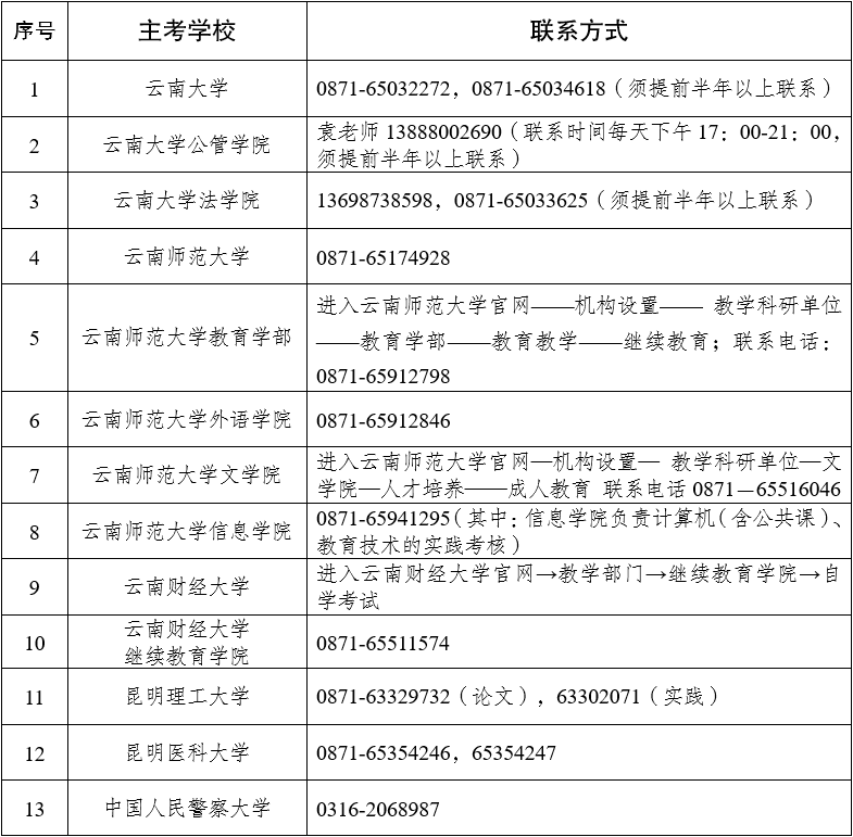 十、云南省高等教育自学考试各专业实践性环节考核、学习、论文答辩联系方式: