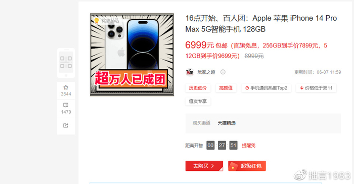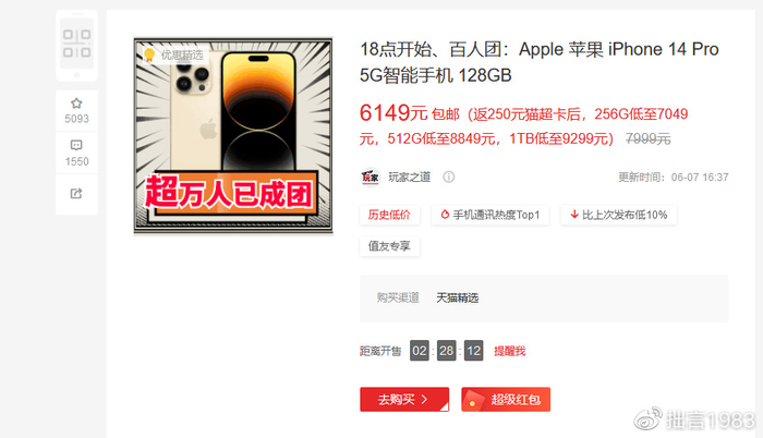 当然,从笔者观察到的情况来看,三个版本的成团中,只有iPhone 14 Pro Max是正儿八经的X猫Apple Store官方旗舰店,在品牌保证和售后方面会更让成团购买的用户放心;其他的两个版本则是第三方店,但想来如此大规模的成团购买情况下,一般也不会出现假冒伪劣产品,加上价格确实足够有吸引力,从一下子就能够万人成团就能够看出它们的吸引力了。
