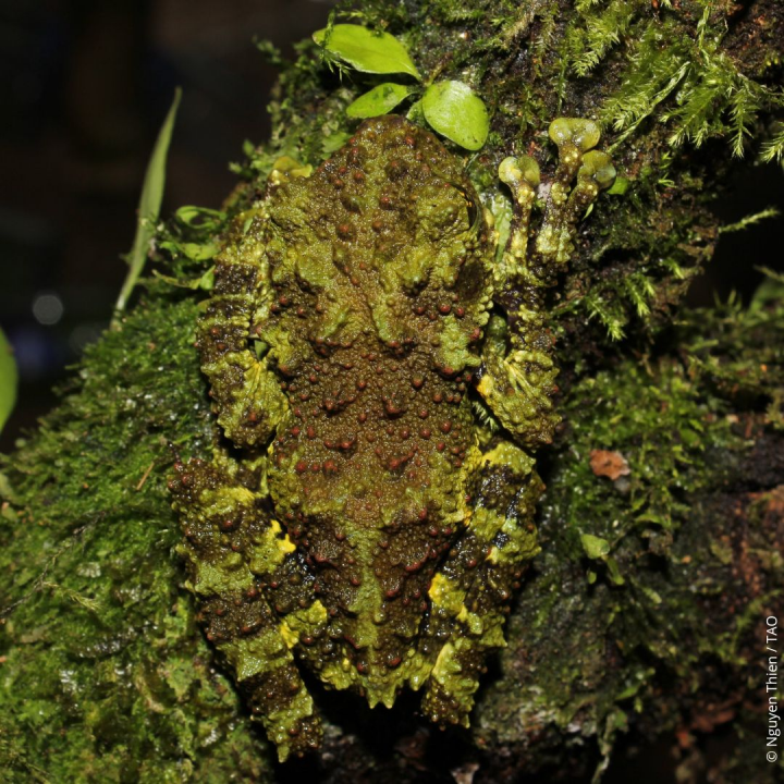 该物种是在越南东北部河江省的野外调查中发现的,它们生活在石灰岩山脉林地的狭窄山谷中,身长约5-6厘米,周身像被绿色苔藓覆盖,皮肤上有不规则的脊和疣,使它们能够轻松“隐身”于环境中。