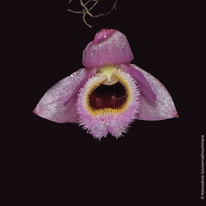 老挝特有种,具观赏性。它的发现历程十分不同寻常:一个苗圃老板在从当地的野生植物供应商处购买了这株植物后,将照片发给了研究当地兰花物种的专家,经过进一步分析,确认了它是一个新物种。据供应商说,这株兰花是在老挝万象卡西区的一座石灰石山上采集的,但搜寻至今,研究人员都还未能在野外找寻到它的踪迹。